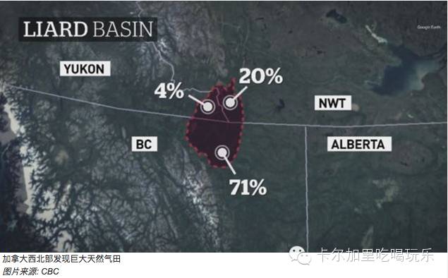 加拿大广播公司报道说,加拿大西北部不列颠哥伦比亚省、育空特区和西北特区交汇处的莱尔德盆地Liard Basin可能是世界上最大的天然气田之一,天然气储量达219万亿立方英尺;按照2014年加拿大全国的天然气消费量计算,可以满足加拿大70年的天然气消费需要。